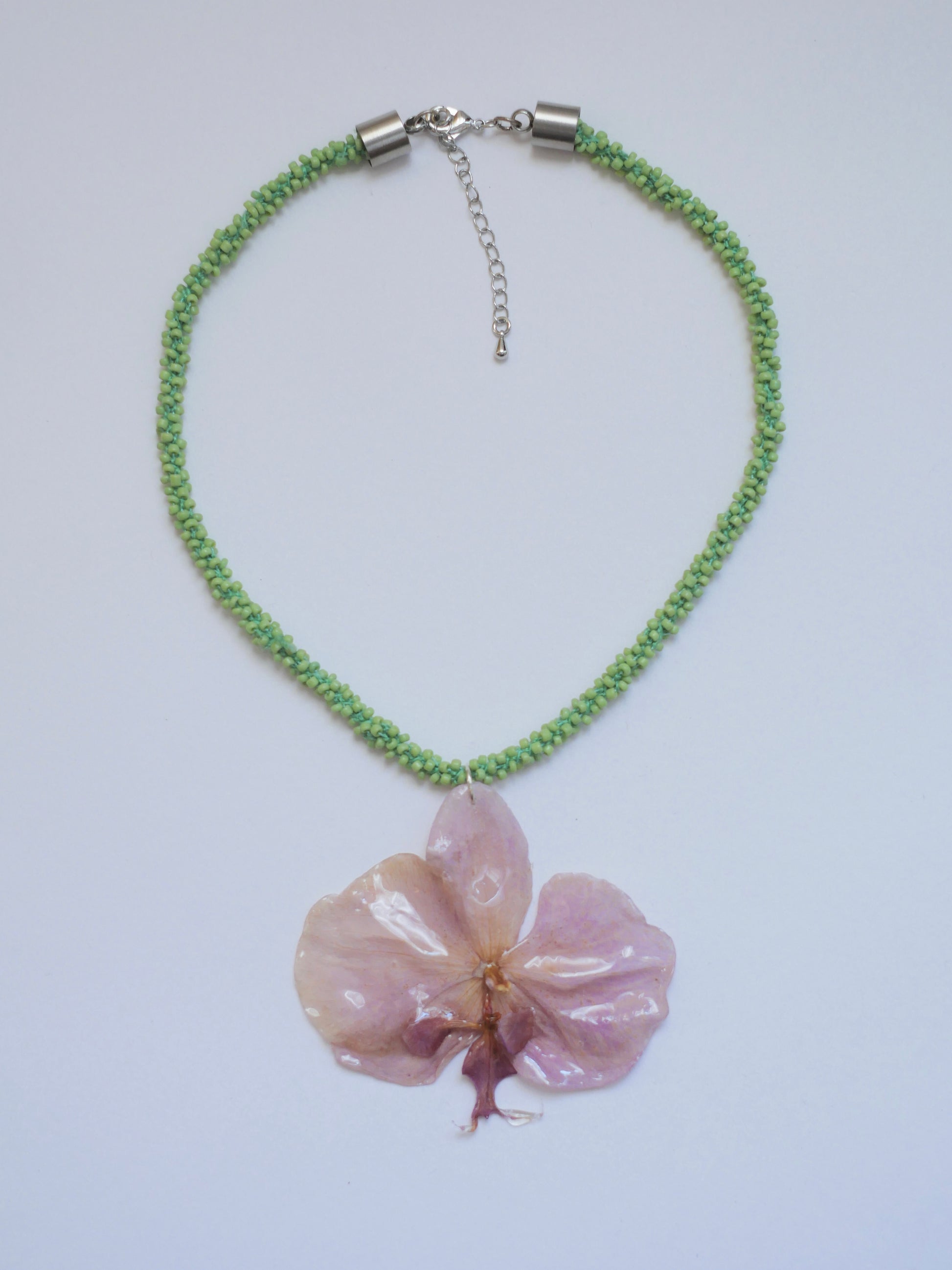 Collar de orquídea natural preservada en color lila en cadena verde de chaquira tejida.