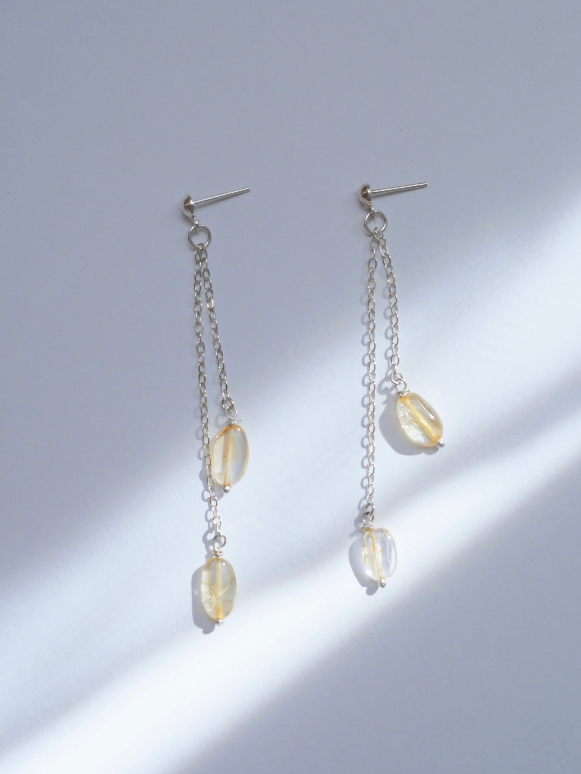 Aretes de plata ley 925 de cadena con citrinos colgando en los extremos. Par único. Longitud del arete 8 cms
