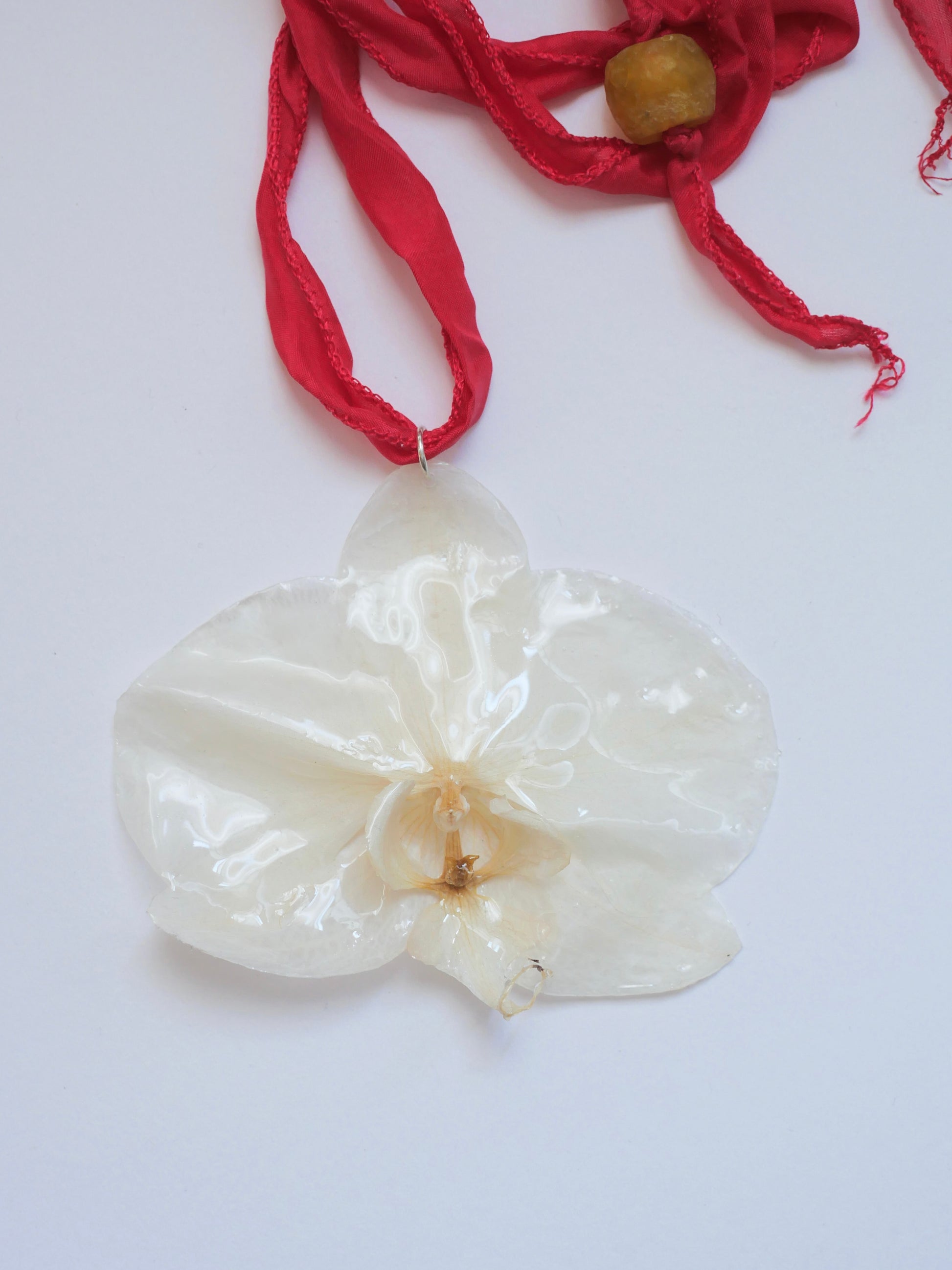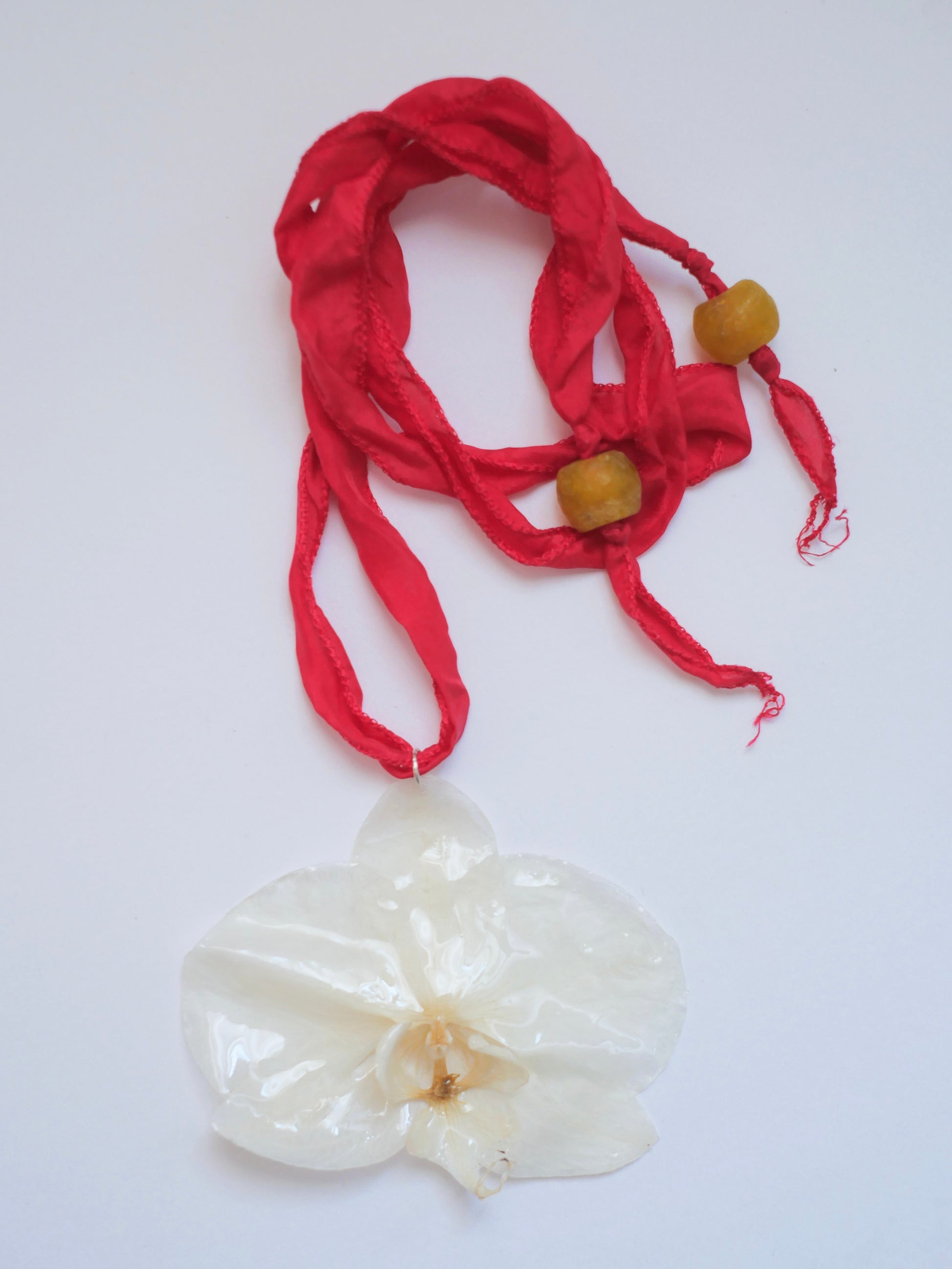 Collar de orquídea natural preservada en listón de seda rosa con dos cuentas de vidrio reciclado en los extremos