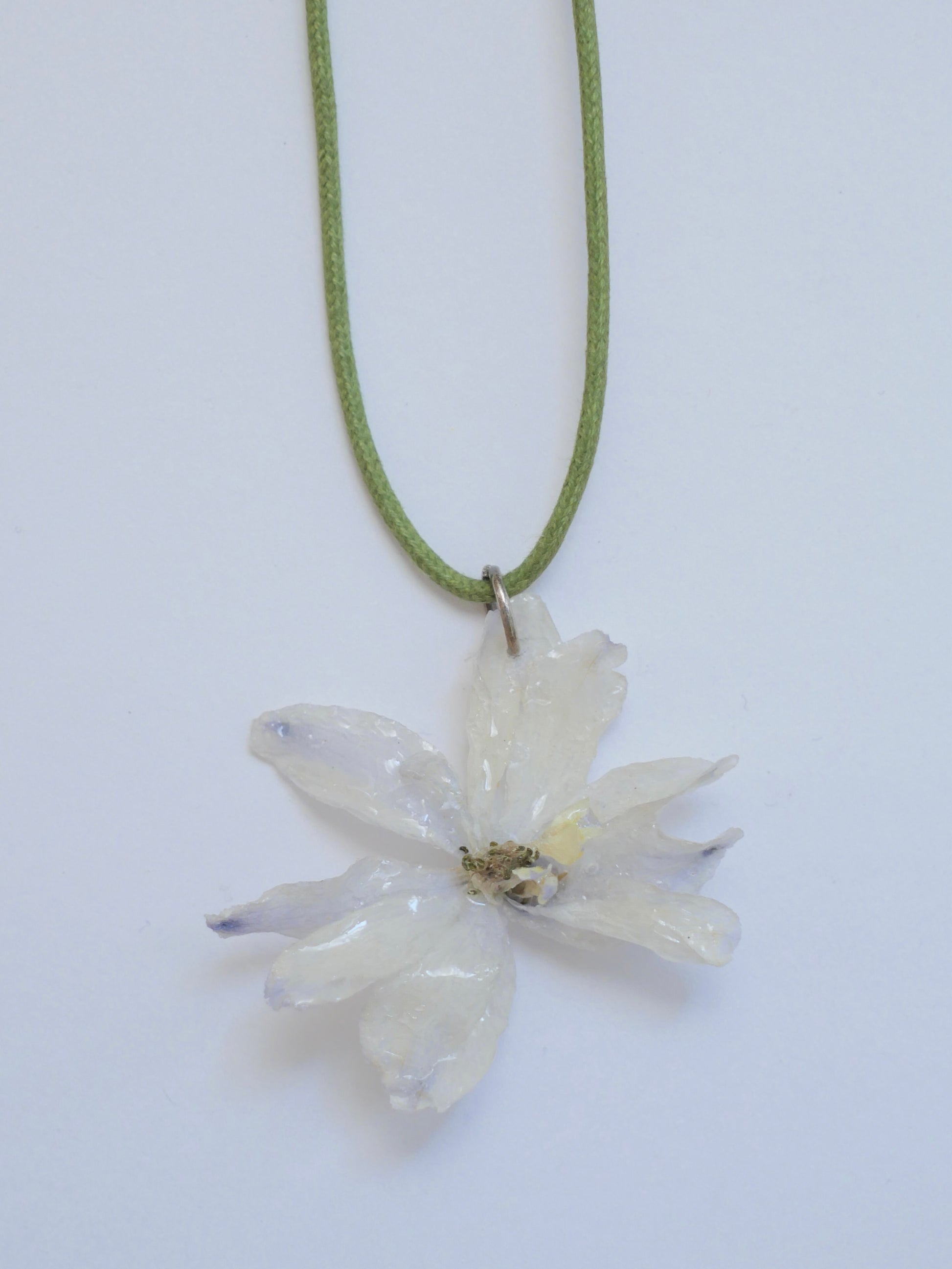 Collar de flor natural preservada en cordón de algodón color verde.