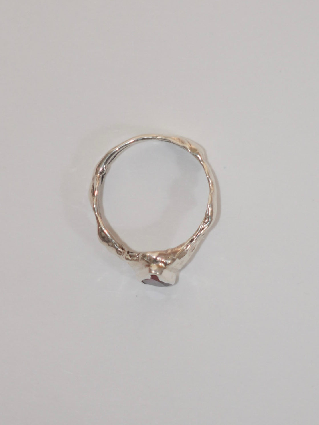Anillo de plata hecho con la técnica de cera perdida con piedra Granate en forma de pera al centro. Pieza única. Talla 6.