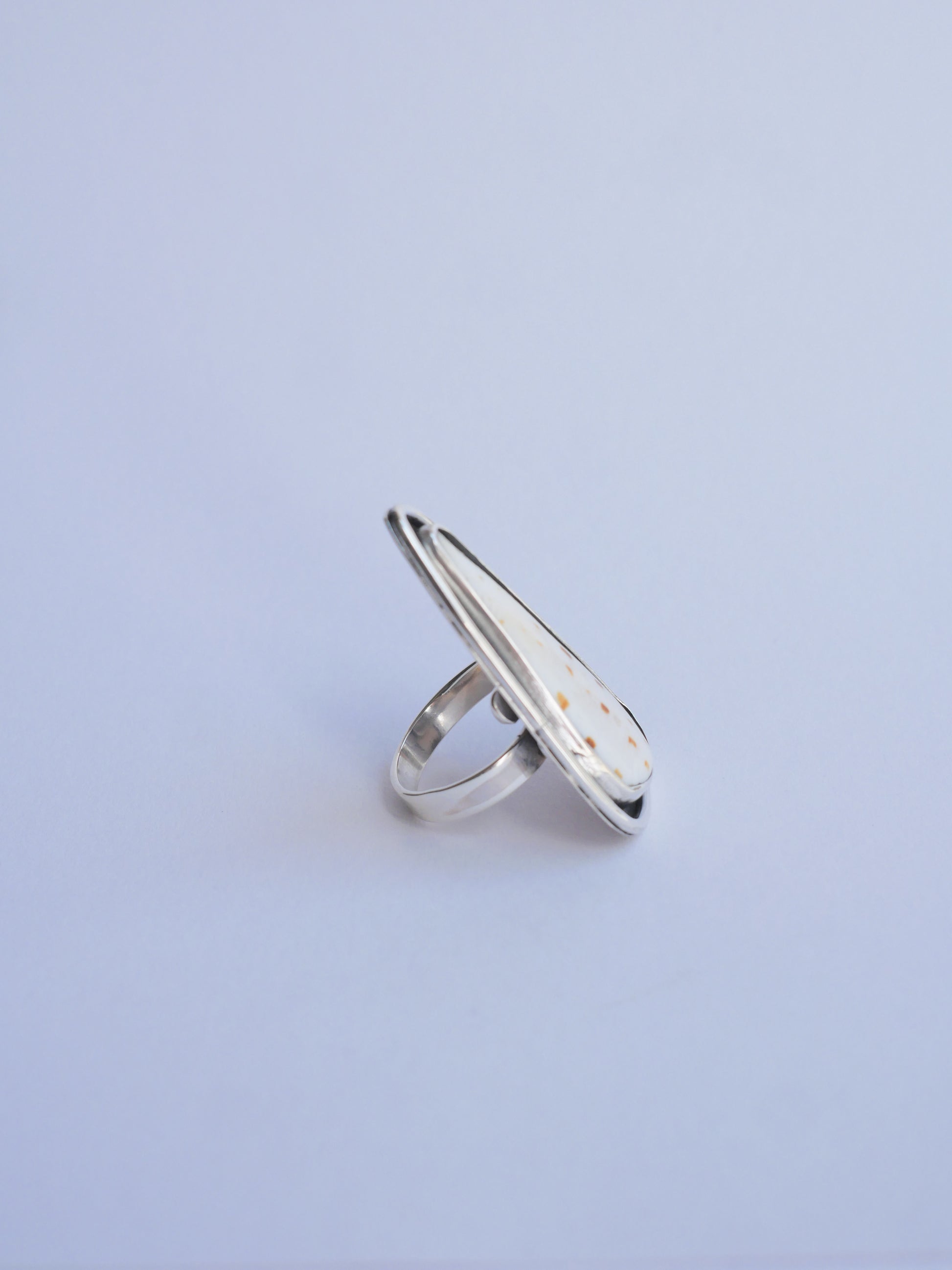 Anillo de plata con detalle oxidado y concha en forma de triángulo. Pieza única, talla ajustable.
