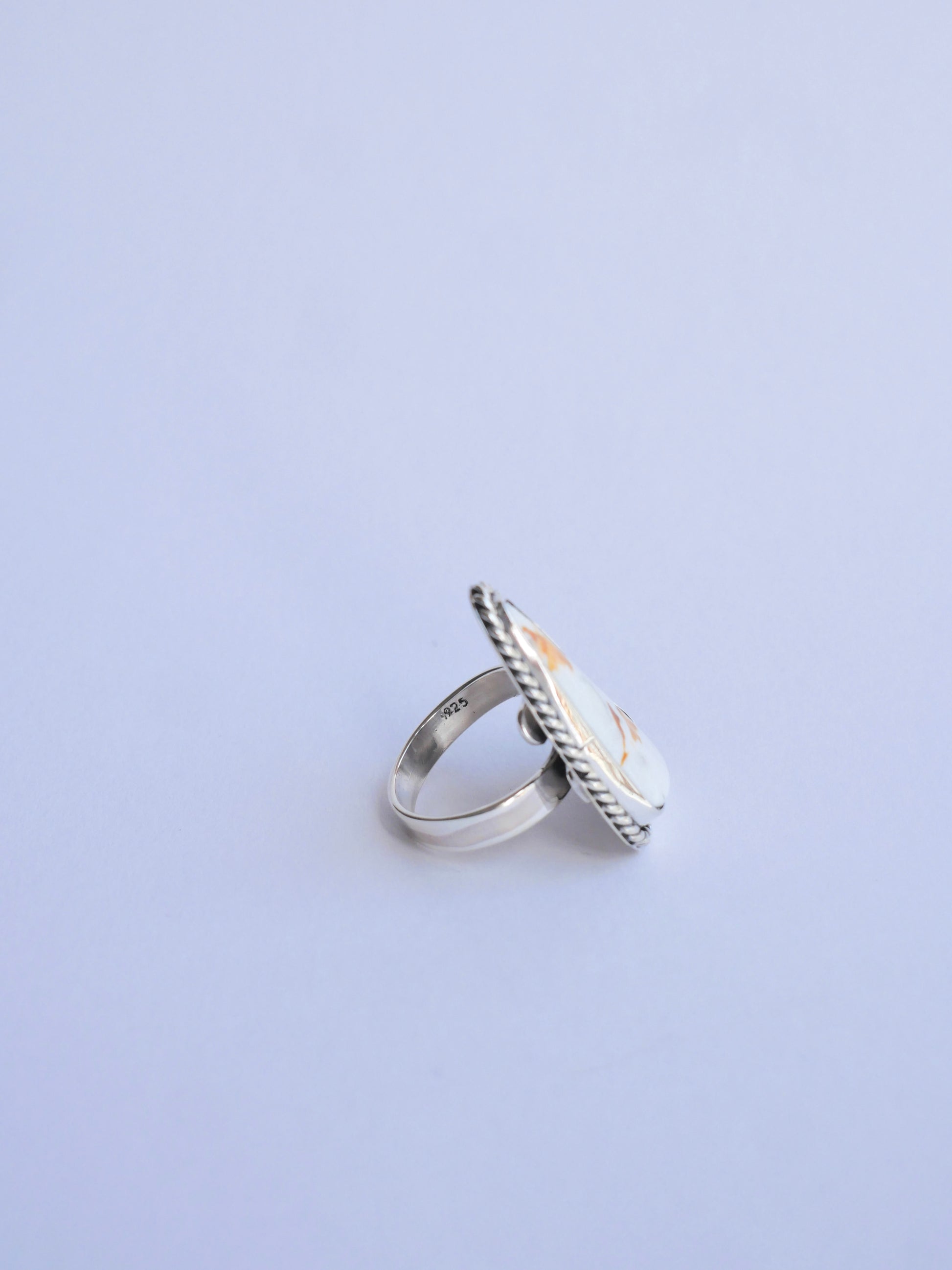Anillo western de plata con concha en forma de triángulo y detalles de plata alrededor. Pieza única, ajustable.