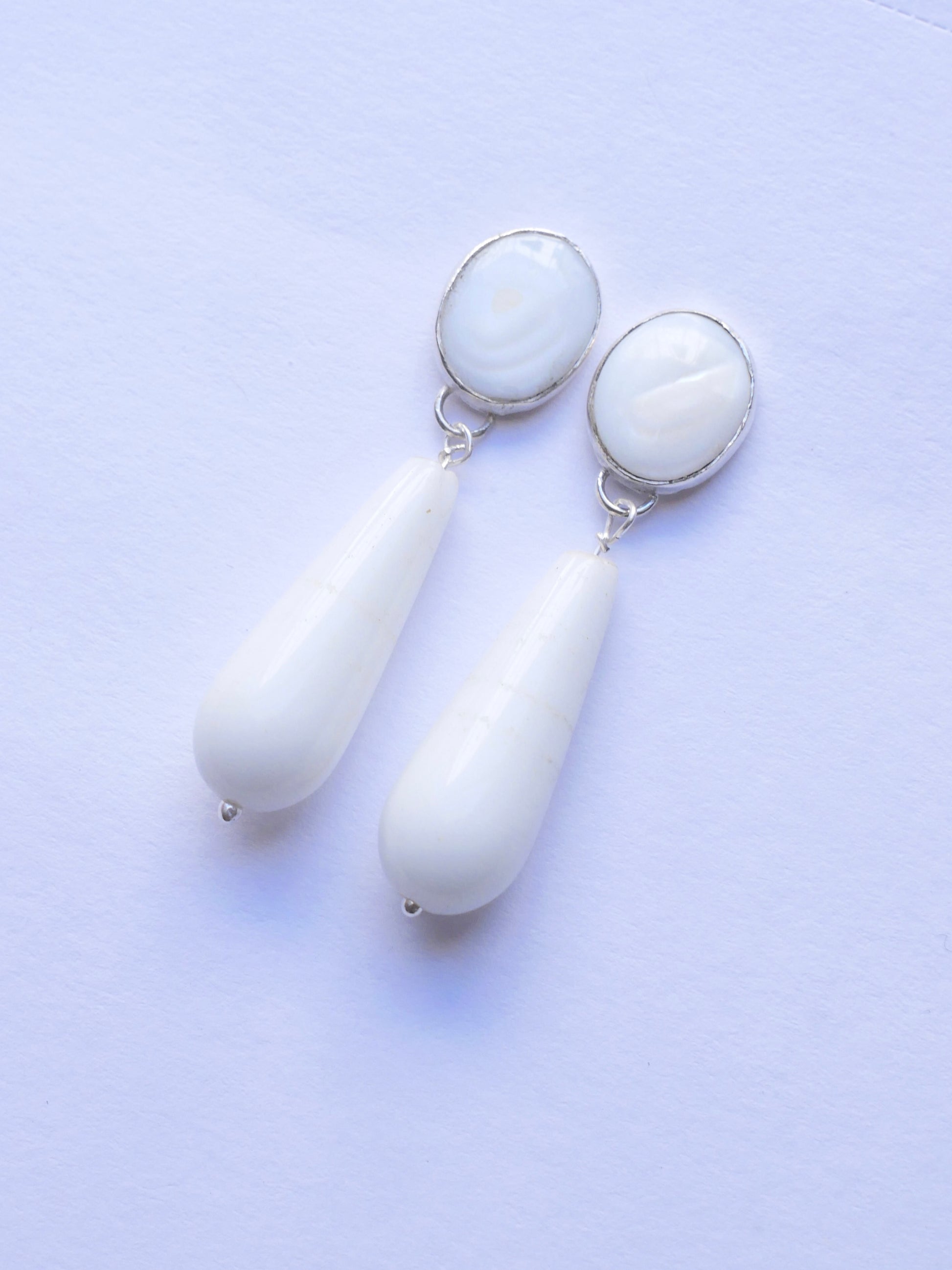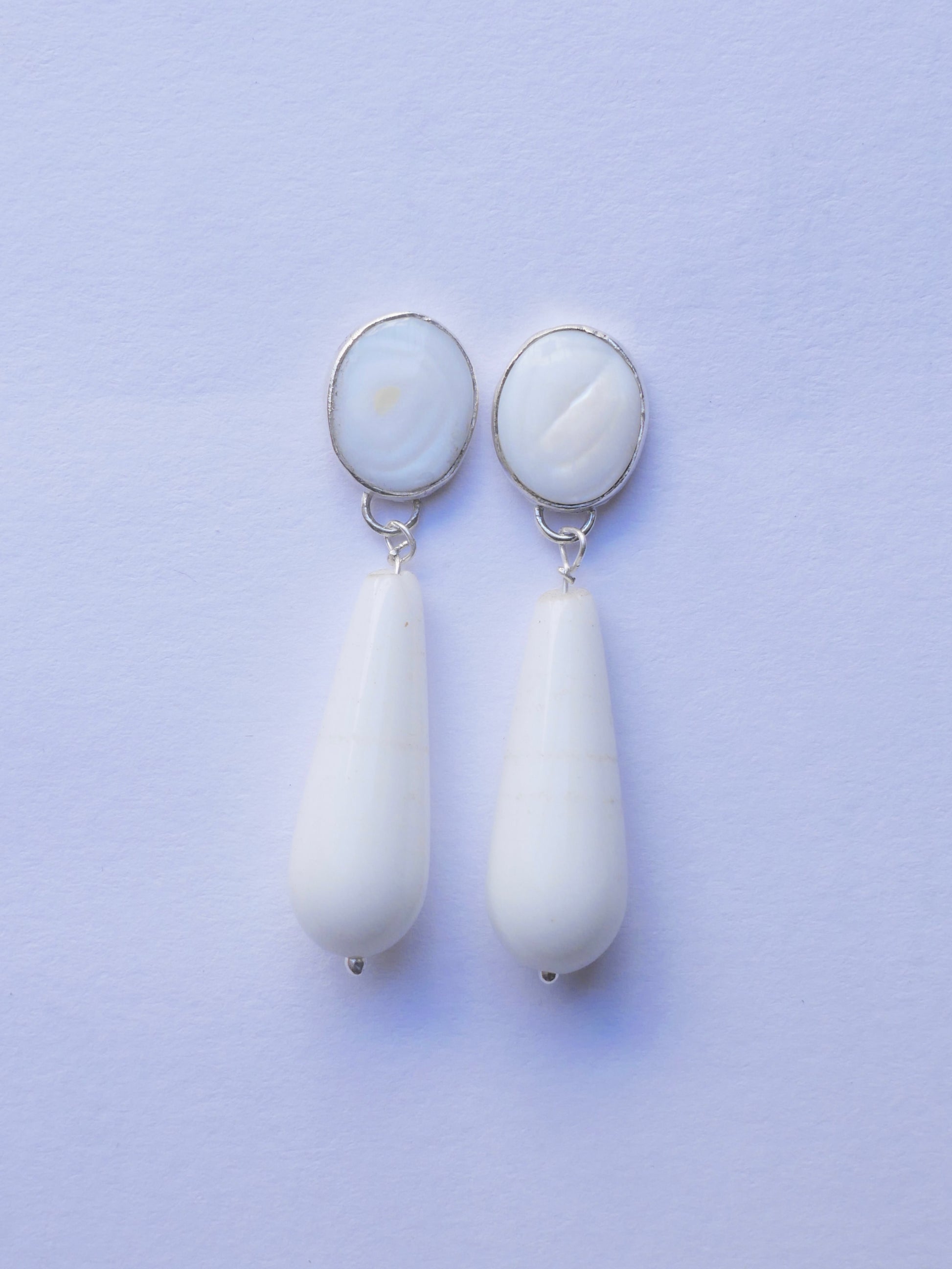 Aretes hechos a mano con plata ley 9.25, con concha natural y colgante en forma de gota de ágata blanca.