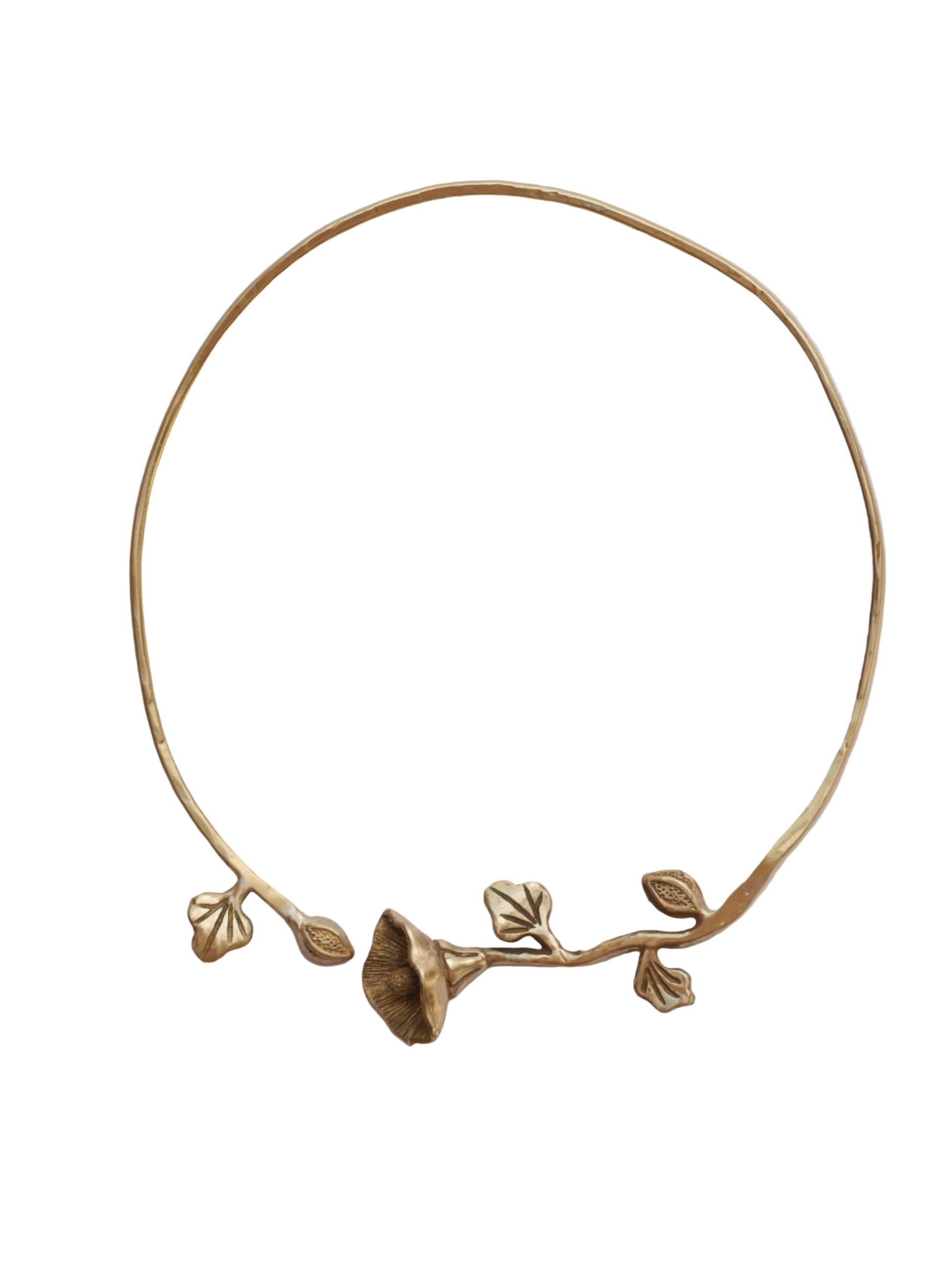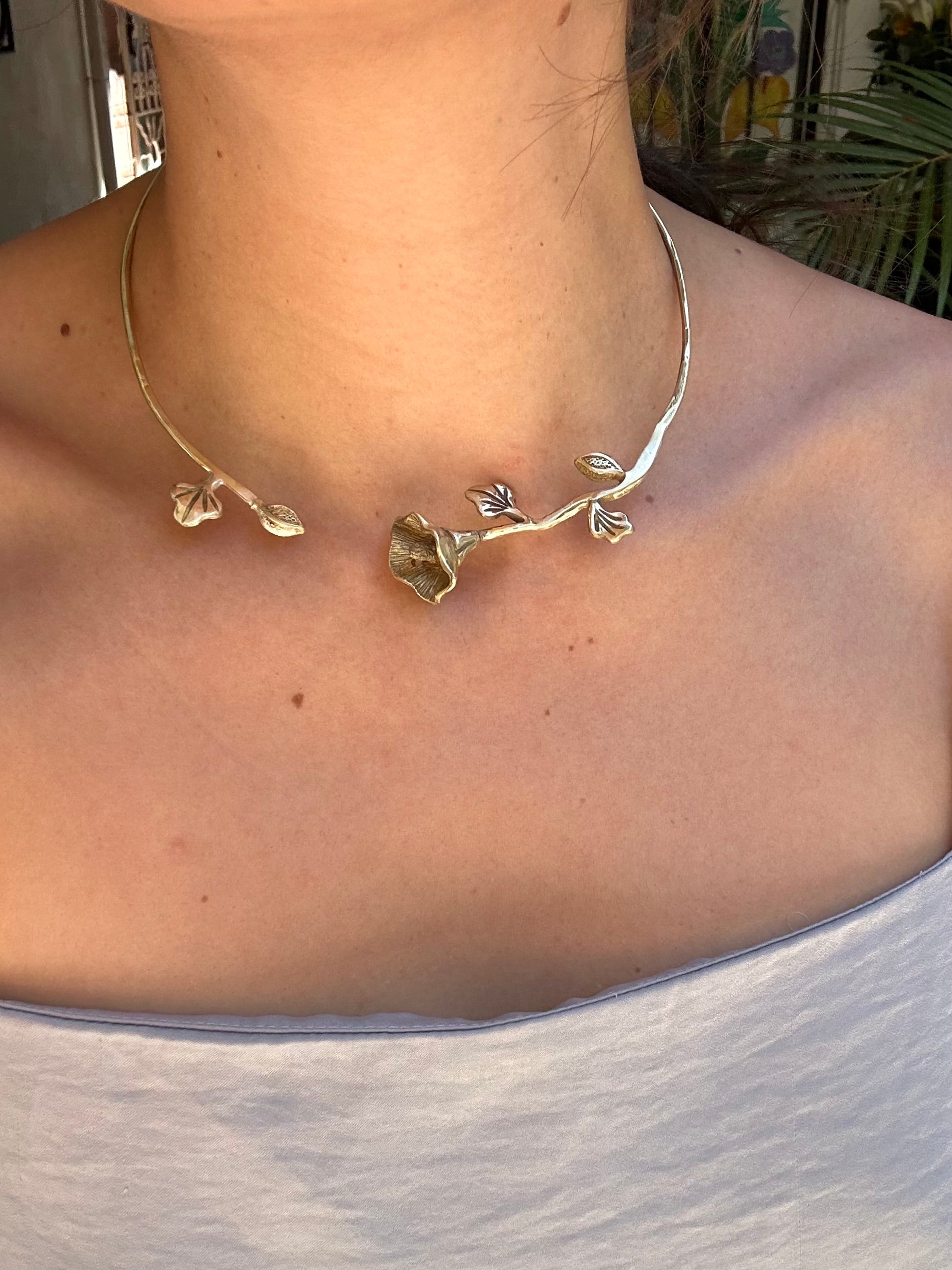 Collar de alcatraz hecho a mano con flor elaborada en la técnica de cera perdida y soldada a alambre de latón.