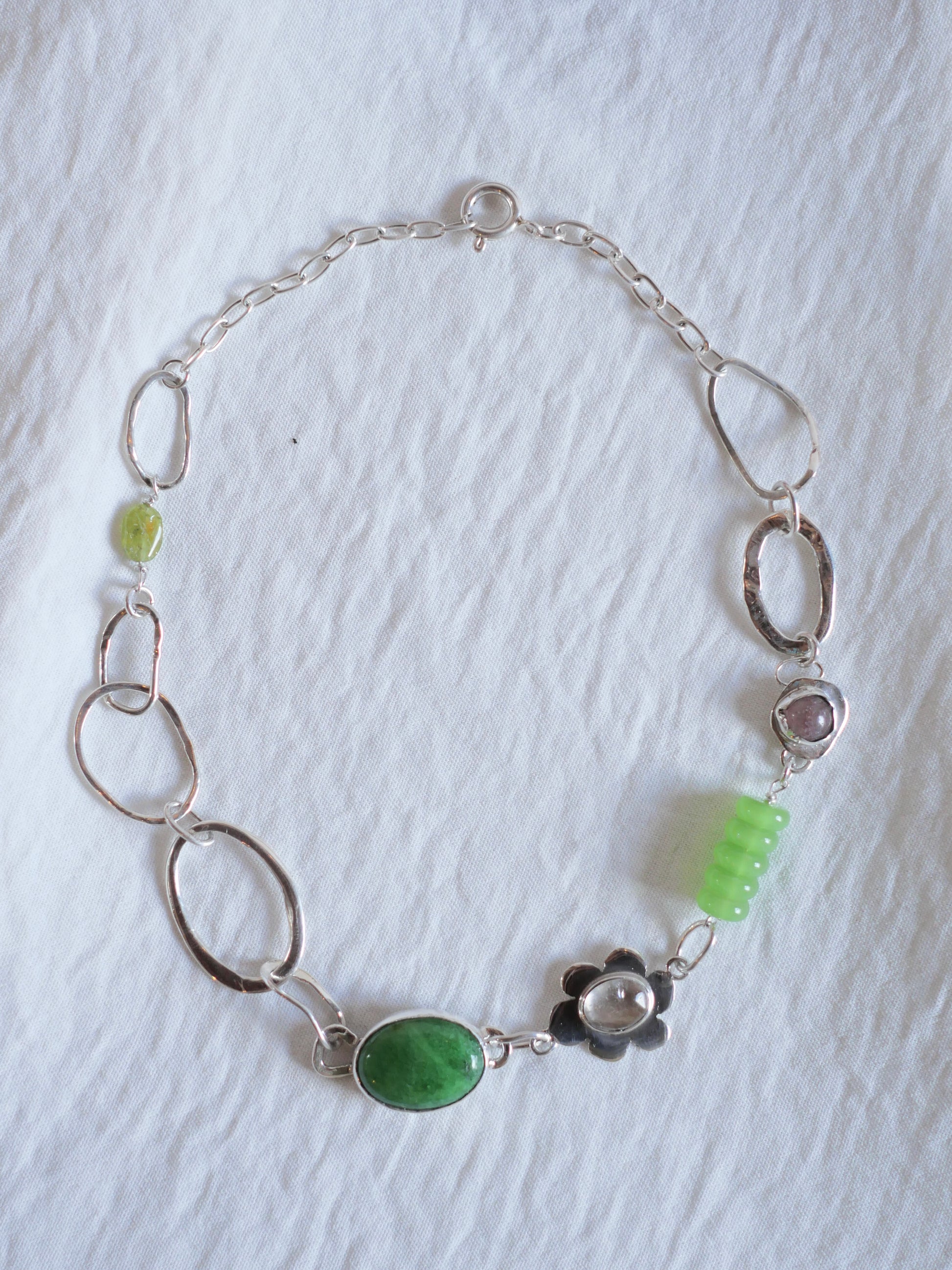 Collar de plata ley 925 hecho a mano con formas de flores, eslabones irregulares y ágatas verde, piedra luna y cuarzo rosa. Pieza única
