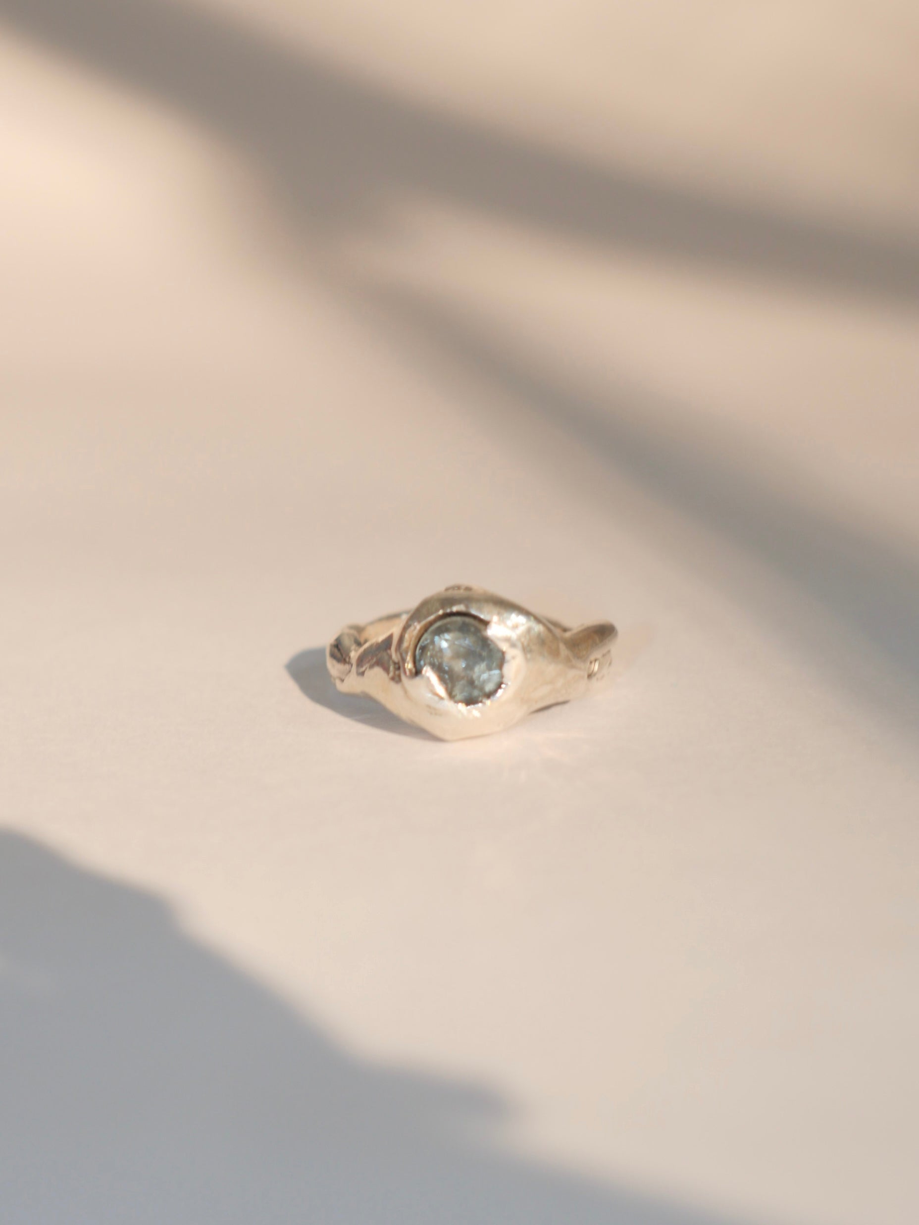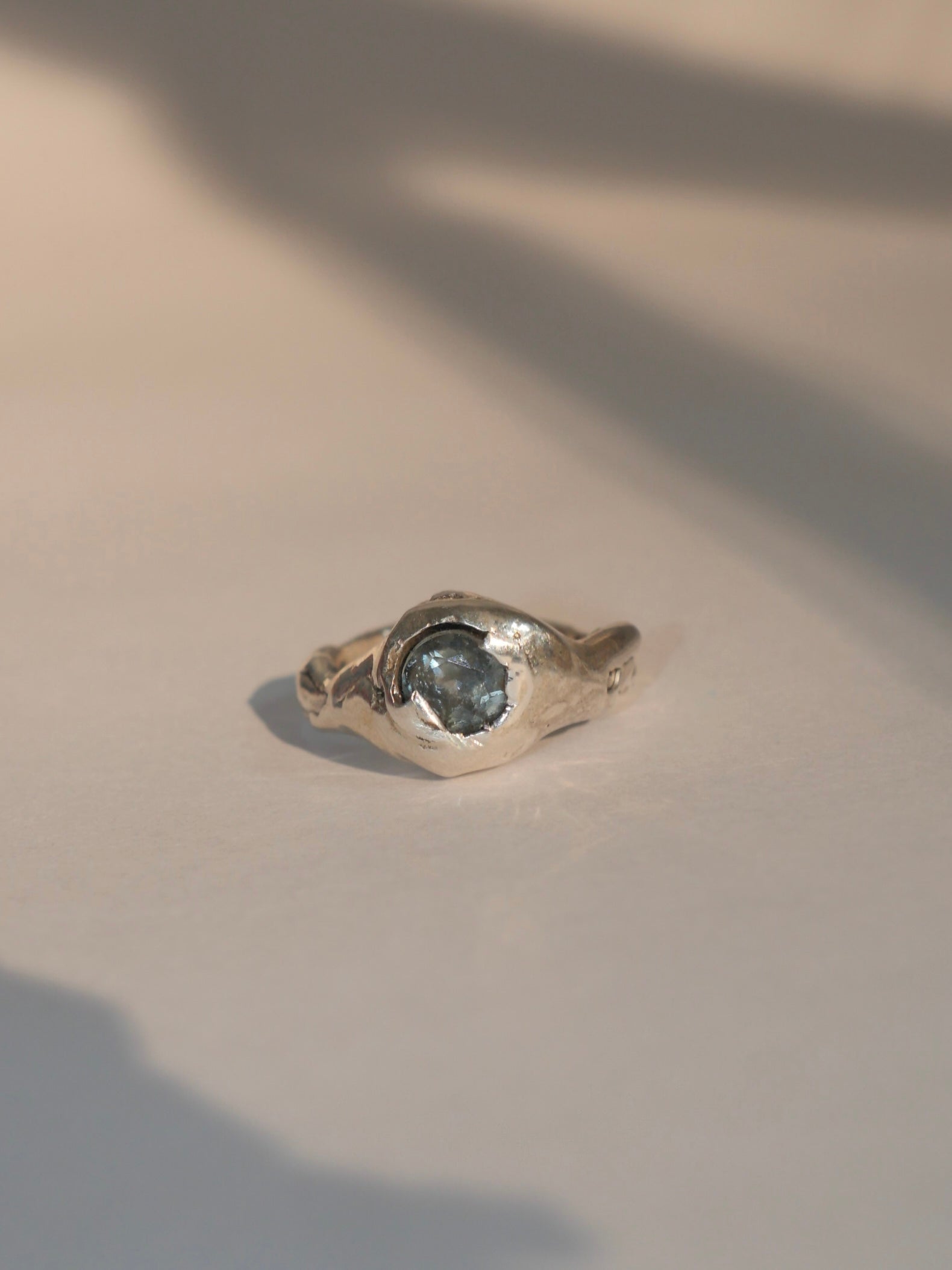 Anillo de plata hecho a mano con la técnica de cera perdida, con topacio Sky blue redondo al centro. Pieza única. Talla 5.5